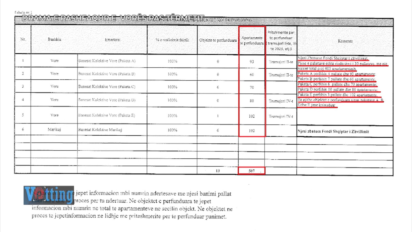 Bashkia në përgjigje të saj ka sqaruar se “ju informojmë se 182 aplikues janë në process për tu trajtuar për banesa private ku përfshihet njësia Vorë, njësia Prezë dhe njësia Bërxullë që përfshihen në territorin e Bashkisë Vorë (Janë akomoduar dhe 50 aplikues për apartamente në fshatin Marqinet , që pritet për t’u trajtuar nga Fondi i Zhvillimit në Bashkëpunim me Ministrinë e Infrastrukturës dhe Energjetikës, Drejtorisë së Rindërtimit ). Gjithashtu janë në mungesë dhe 60 apartamente (nevoja për rindërtim ku përfshihen dhe procesi i shpronësimit) për qytetin e Vorës”.