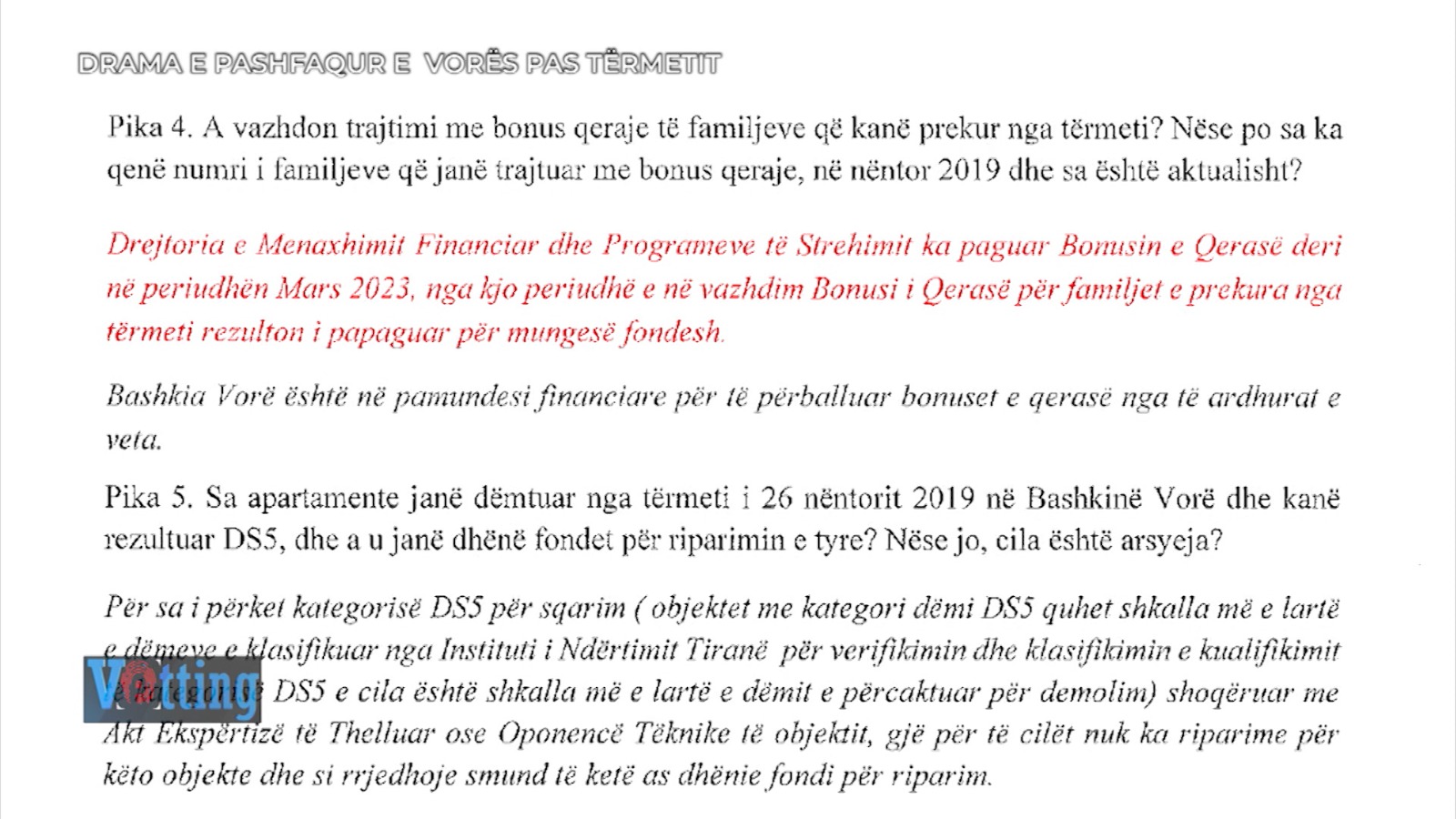 Në përgjigje të emisionit Vetting, Bashkia Vorë pranon situatën e vështirë të banorëve të pastrehë por justifikohet me mungesën e fondeve. Emisioni Vetting ka dërguar kërkesë për informacion Bashkisë Vorë në lidhje me procesin e rindërtimit.