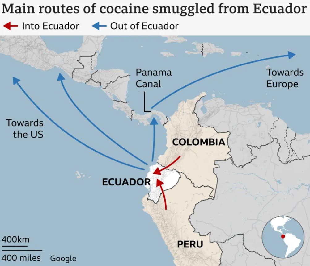 Pavarësisht se Ekuadori nuk e prodhon vetë drogën, 70% e kokainës në botë kalon përmes porteve të saj, sipas presidentit të vendit, Daniel Noboa. Lënda narkotike kontrabandohet nga shtetet fqinje, Kolumbia dhe Peruja, të cilat janë dy prodhueset më të mëdha të kokainës.