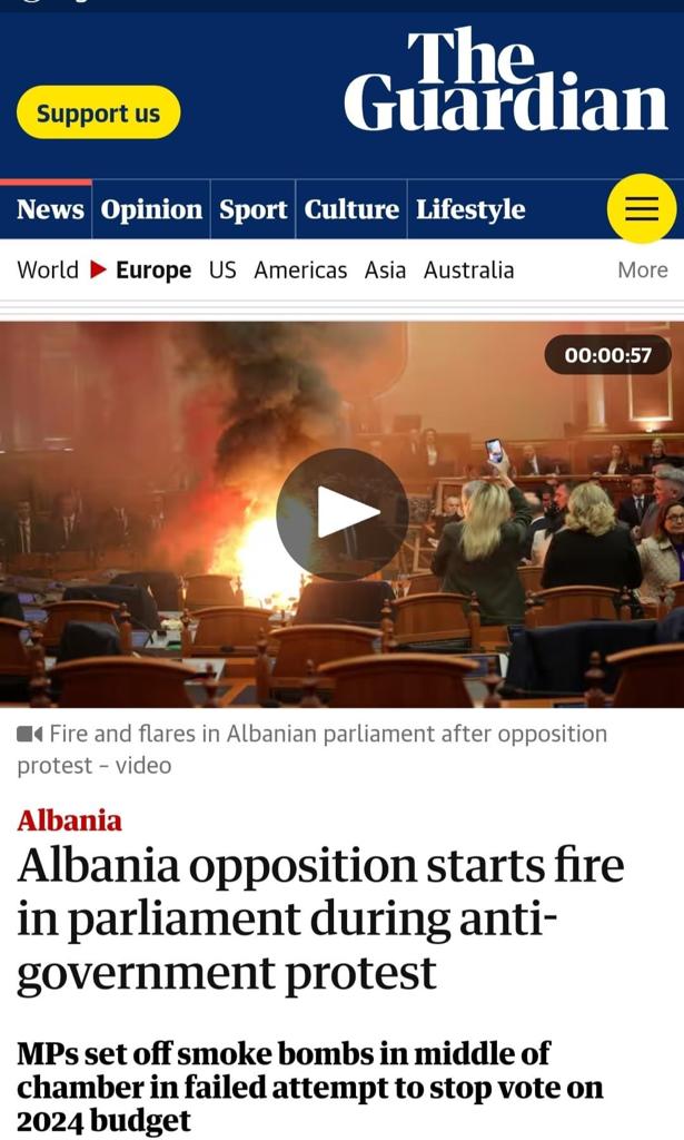 The Guardian: Opozita shqiptare nis zjarr në Parlament gjatë protestës antiqeveritare