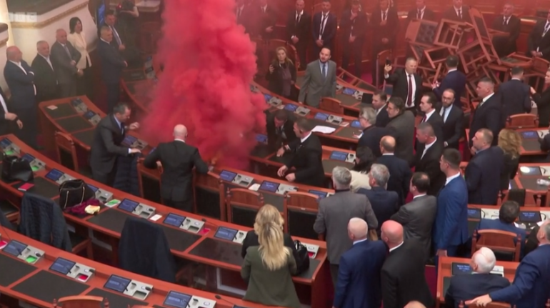 “Politikanët e opozitës shqiptare ndezën tym dhe zjarr në Parlament në një përpjekje për të ndaluar votimin e dhomës për buxhetin e 2024-ës. Ligjvënësit e opozitës po protestonin kundër asaj që ata thanë se ishte një sundim gjithnjë e më autoritar nga Partia Socialiste në pushtet”, shkruan BBC.