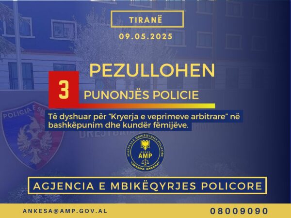 Në vijim të hetimeve lidhur me procedimin penal të vitit 2025, Agjencia e Mbikëqyrjes Policore (Rajoni Tiranë) ka ekzekutuar Vendimin e Gjykatës së Shkallës së Parë të Juridiksionit të Përgjithshëm Tiranë, e cila ka caktuar masat e sigurimit personal me karakter shtrëngues “Detyrim për tu paraqitur në Policinë Gjyqësore” dhe “Pezullim i ushtrimit të një detyre a shërbimi publik” ndaj 3 punonjësve të policisë të dyshuar për kryerjen e veprës penale “Kryerja e veprimeve arbitrare” në bashkëpunim dhe kundër fëmijëve.