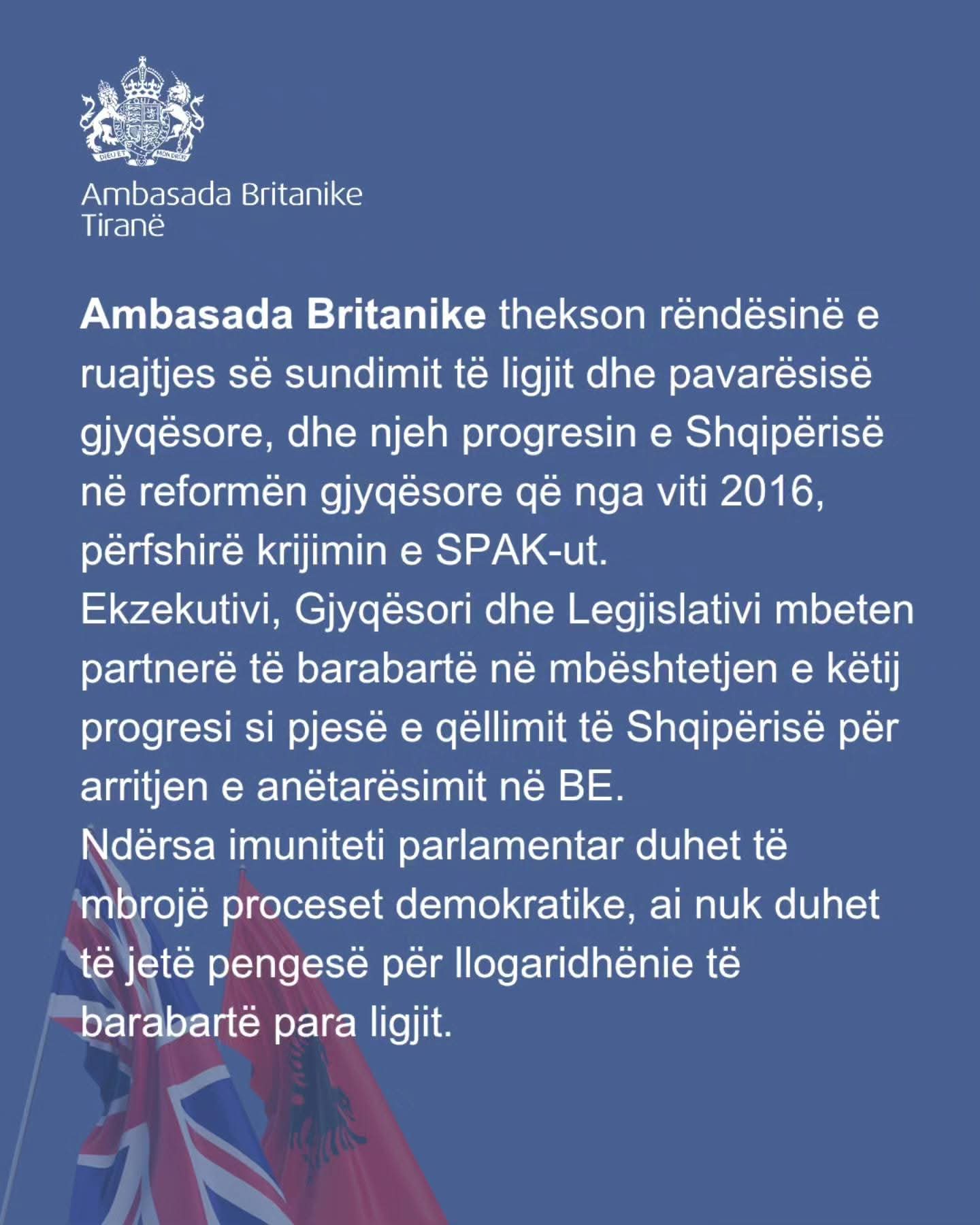 “Ambasada Britanike thekson rëndësinë e ruajtjes së sundimit të ligjit dhe pavarësisë gjyqësore, dhe njeh progresin e Shqipërisë në reformën gjyqësore që nga viti 2016, përfshirë krijimin e SPAK-ut. Ekzekutivi, Gjyqësori dhe Legjislativi mbeten partnerë të barabartë në mbështetjen e këtij progresi si pjesë e qëllimit të Shqipërisë për arritjen e anëtarësimit në BE. Ndërsa imuniteti parlamentar duhet të mbrojë proceset demokratike, ai nuk duhet të jetë pengesë për llogaridhënie të barabartë para ligjit”, thuhet në postimin e Ambasadës britanike.