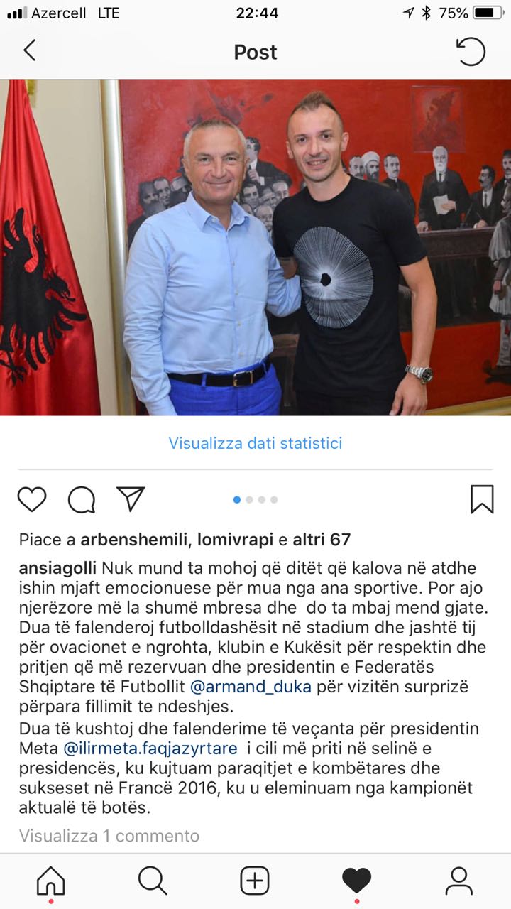 Dua të kushtoj dhe falenderime të veçanta për presidentin Meta @ilirmeta.faqjazyrtare i cili më priti në selinë e presidencës, ku kujtuam paraqitjet e kombëtares dhe sukseset në Francë 2016, ku u eleminuam nga kampionët aktualë të botës”, shkruan agolli në rrjetin social “Twitter”.