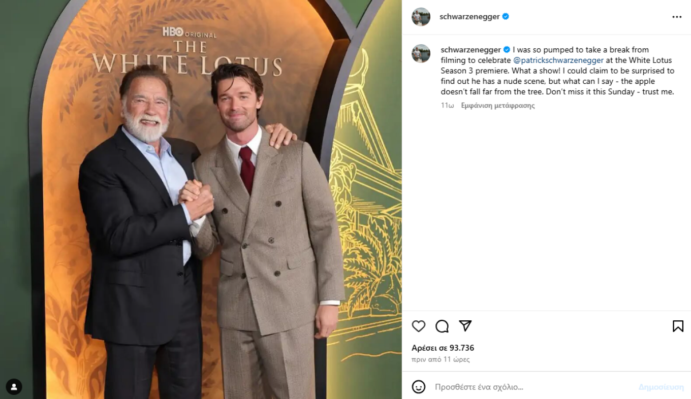 Arnold Schwarzenegger bëri një koment për skenën nudo të djalit të tij, Patrick, në premierën e sezonit të tretë të serialit “White Lotus “, ku ai mori pjesë të hënën në mbrëmje në Los Angeles. “Çfarë shfaqjeje!” shkroi ylli i ‘Terminator’ të martën në Instagram, duke e shoqëruar postimin e tij me një foto të djalit të tij. “Mund të them se jam i habitur që ka një skenë nudo, por çfarë të them, molla bie nën mollë”, shtoi ai. Aktori 77-vjeçar vazhdoi duke u kërkuar fansave të tij që të shikojnë episodin: “Mos e humbisni këtë të dielë, më besoni”.