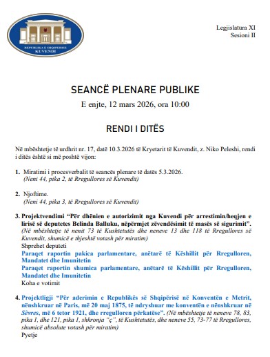 Kuvendi i Shqipërisë ka publikuar agjendën e punimeve të seancës së 12 marsit, ku pritet të diskutohet kërkesa për dhënien e autorizimit për arrestimin e Belinda Ballukut.