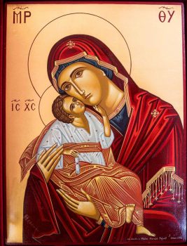 Teologjia e Ikonës: Ikona e Shën Marisë, ‘Puthja e ëmbël’, paraqet Shën Marinë dhe Fëmijën e saj, në pozicion të dashurisë së natyrshme ndërmjet Nënës dhe Fëmijës. Krishti mban në dorë një pergamen të mbështjellë, që është simboli i Ungjijve dhe me dorën tjetër përkedhël Nënën e Tij.