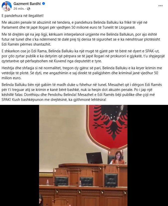 Kreu i grupit parlamentar të PD, Gazment Bardhi i kërkon Belinda Ballukut të dorëhiqet dhe të bëhet e penduara e drejtësisë, pas marrjes të pandehur nga SPAK. Bardhi tha se Balluku iu fsheh Kuvendit sot, ku opozita e kërkoi në interpelancë urgjente për aferën e tunelit të Llogarasë, por socialistët rrëzuan kërkesën.