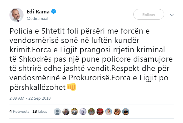 “Policia e Shtetit foli përsëri me forcën e vendosmërisë sonë në luftën kundër krimit. Forca e Ligjit prangosi rrjetin kriminal të Shkodrës pas një pune policore disamujore të shtrirë edhe jashtë vendit. Respekt dhe për vendosmërinë e Prokurorisë. Forca e Ligjit po përshkallëzohet?”, shkruan kryeministri Rama në Twitter.