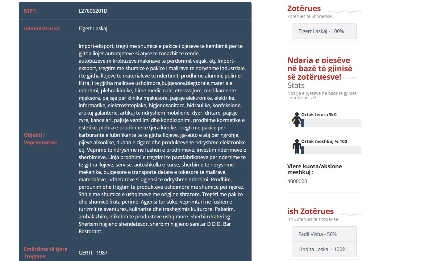 Laskaj është ndërkohë pronar i kompanisë së sipër përmëndur ‘GERTI -1987’. Pasi ka blerë 100% të aksioneve për 100 mijë lekë në vitin 2018, Laskaj ka shtuar objektin e veprimtarisë së kompanisë që shiste pjesë fadromash, në subjekt për shitje të ushqimeve, bulmetit dhe fruta perime. Por jo vetëm kaq me anë të gruas së tij, Olta Sharra si person fizik me NIPT: L32517203Q, grabitësi i Rinasit, Gentian Sharra ka marrë mbi 14 milionë USD tendera nga Bashkia Elbasan, Librazhd, Agjencia e Blerjeve të Përqendruara në Ministrinë e Brendshme.