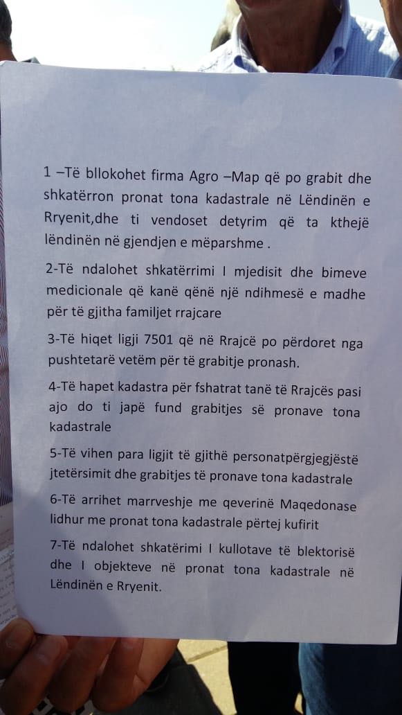 1-Të bllokohet firma Agro-Map që po grabit dhe shkatërron pronat tona kadestrale në Lëndinën e Rryenit dhe ti vendoset me detyrim që ta kthejë lëndinën në gjendjen e mëparshme.