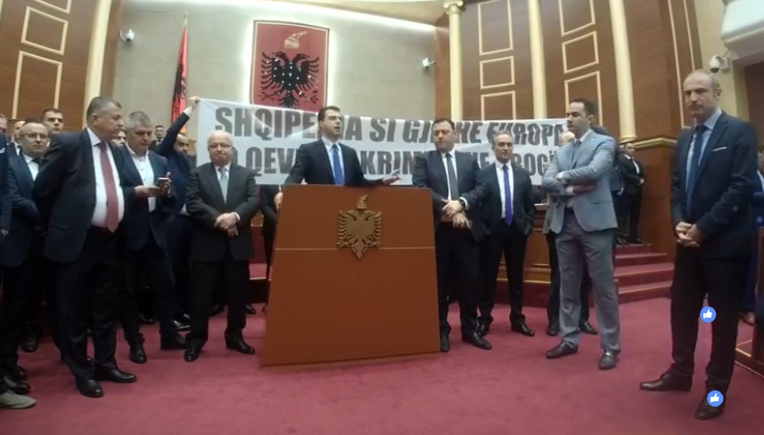 TIRANE– Kreu i Partisë Demokratike, Lulzim Basha, ka vijuar akuzat ndaj kryeministrit Rama dhe ministrit të Brendshëm, Fatmir Xhafaj. Nga foltorja e bllokuar e Kuvendit, kryedemokrati thotë se Rama dhe Xhafaj janë dy përgjegjësit kryesorë nëse Shqipëria nuk merr në qershor hapjen e negociatave me BE.