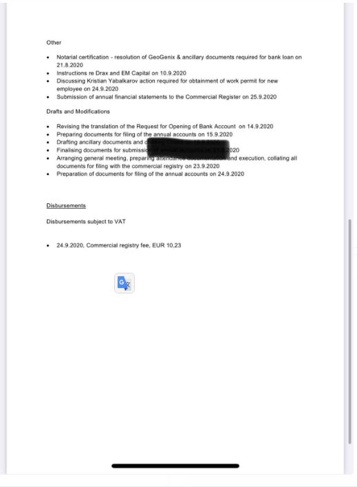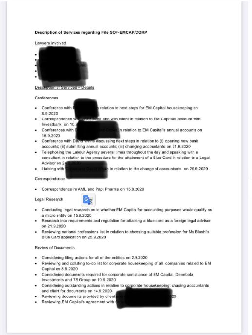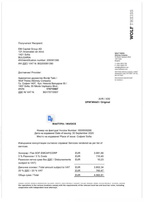 Ky dokument është një faturë e lëshuar nga kompania Wolf Theiss, kompani ë mirënjohur ndërkombëtarisht për shërbimet e konsulencës dhe avokatisë, lëshuar për kompaninë EM Capital Group. Wolf Theiss ka ofruar çdo shërbim të mundshëm për kompaninë EM Capital, përfshirë dhe regjistrimin e kompanive të reja, sipas kërkesës të kësaj të fundit. Në faqen 3 të këtij dokumenti, kjo kompani ka faturuar shërbime për regjistrimin e 2 kompanive të reja, njëra e quajtur Denebola Investments dhe tjetra e quajtur 7S Group.