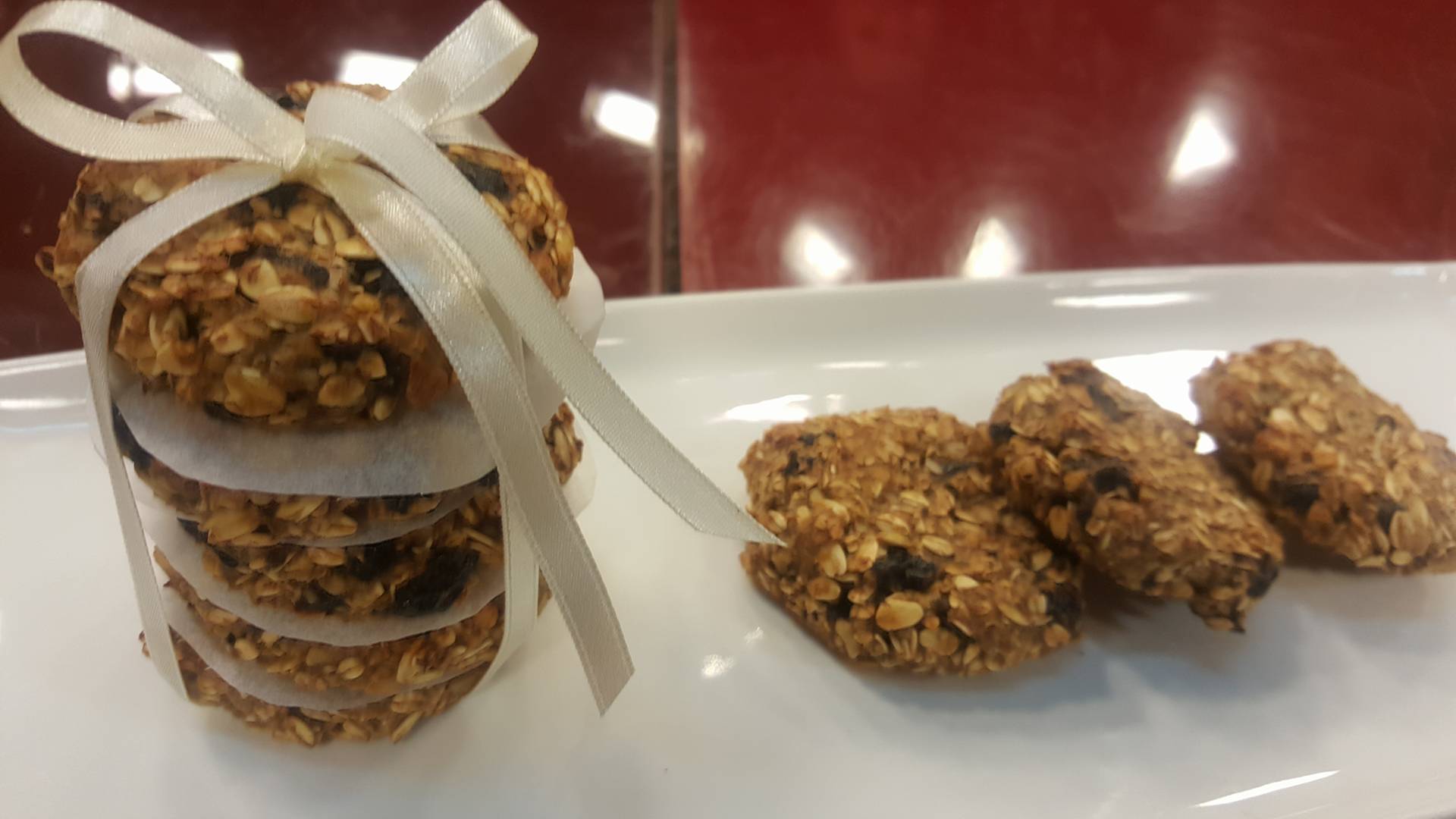 Fillimisht qërojmë bananen dhe e shtypim më pas me pirun bananen derisa të zbutet. Shtojmë më pas 1 lugë mjaltë, pak kanellë, kumbulla të thata të prera në copa të vogla, arrat dhe bajamet e grira në copëza. Shtojmë në fund tërshërën dhe e punojmë mirë brumin e biskotave. Në fund shtojmë dhe pak lëng portokalli.