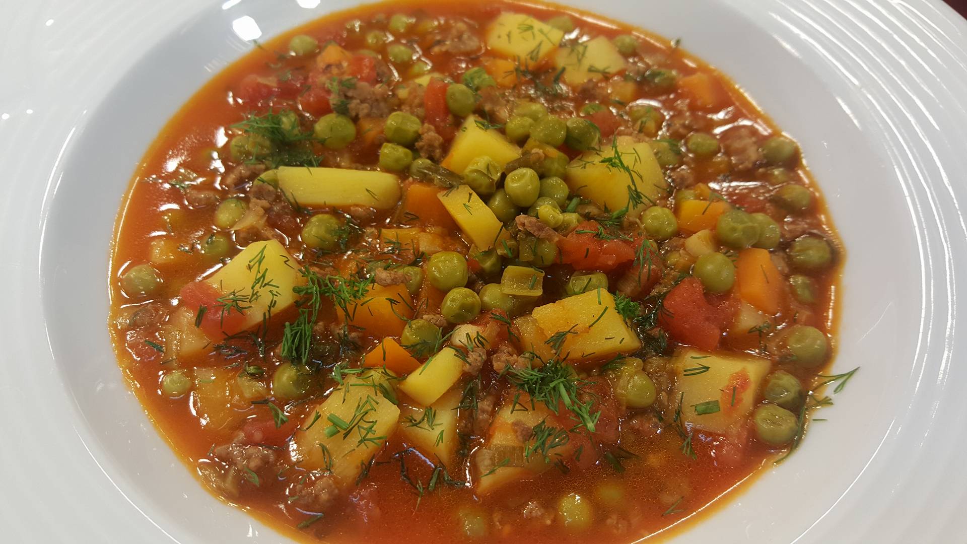 Fillimisht ngrohim vajin, shtojmë në të mishin në thela ose mish të grirë dhe e kaurdisim derisa mishi të mos lëshojë më leng. Shtojmë më pas qepët e njoma të prera në unaza, i kaurdisim së bashku me mishin ndërkohë shtojmë karrotat dhe patatet të prera në kubikë. Më pas shtojmë domatet së bashku me salcën dhe në fund shtojmë bizleet. E rregullojmë gatimin me kripë, shtojmë ujë derisa bizelet të mbulohen dhe i lemë të ziejnë në temperaturë mesatare derisa të gjitha perimet të jenë zjerë. Para se t’a shërbejmë gjellën me bizele grijmë pak koper dhe piper të zi.