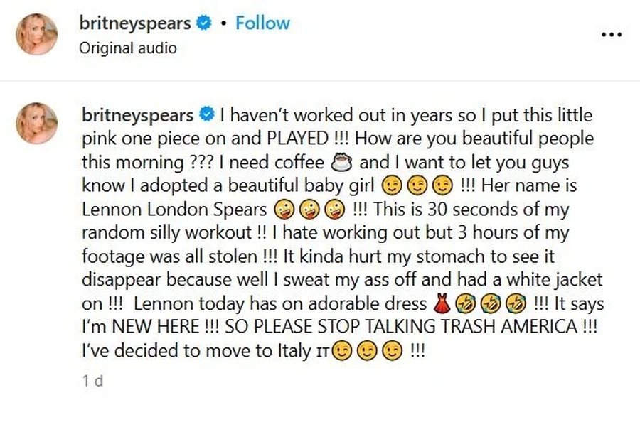 Në një postim në Instagram që paraqet një nga videot e saj karakteristike të vallëzimit, këngëtarja e hitit Toxic shkroi: