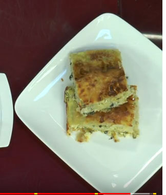 Lyejmë tepsinë me pak vaj ose gjalpë dhe shtrojmë 2 petë. Ruajmë një petë për në fund, ndërsa petët e tjera i copëtojmë me dorë. Mbi petët e shtruara spërkasim pak përzierje me gjizë, vezë dhe qepë. Mbi mbushje shpërndajmë copëza petash, përseri vendosim mbushje me gjizë dhe qepë. Kështu alternojmë shtresa, por mund t’i vendosim dhe të gjitha copëzat e petave në tasin me gjizë dhe qepë. I përziejmë dhe i shtrojmë mbi bazën e petës që kemi vendosur në tavë. E mbulojmë në fund me petën e plotë që hoqëm mënjëanë. Mbledhim anët dhe e vendosim byrekun të piqet në furrë në temperaturën 200 gradë Celsius për 35-40 minuta.