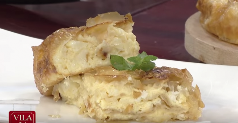 Lyejme fillimisht nje tave me vaj ulliri. Përziejmë vajin e ullirit me qumështin dhe e lemë mënjëanë për spërkatjen e petëve. Në një tas trazojmë vezët me kosin, djathin dhe dy llojet e miellit. Vendosim në tavë 3 petë, i spërkasim me masën me vaj dhe qumësht. Më pas vendosim mbushje me djath dhe kos, vendosim përsëri 3 petë spërkatur me yndyrë, përsëri mbushje dhe në fund petë të spërkatura mirë me vaj dhe qumësht. E vendosim byrekun ne furrën e parangrohur në temperaturën 180 gradë Celsius për 40-45 minuta.