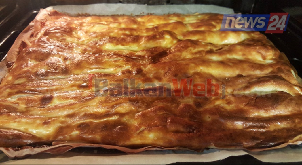 Në një tavë vendosim një letër pjekje duke e mbuluar të gjithë sipërfaqen e tavës. Mbi letër shtrojmë 2 petë duke mos i spërkatur fare me yndyrë. Më pas marrim një petë dhe e palosim ate si fizarmonikë zig zag me një gjerësi 3 cm ose 2 gishta fletët e fizarmonikës. E vendosim më pas në tavë në anë petën fizarmonikë dhe kështu vazhdojmë me të gjitha petët e tjera derisa të mbushet tava. Petët nuk duhet të ngjeshen shumë njëra me tjetrën por duhen lënë lirshëm. Në fund me një spatul hapim hapësirat e fizarmonikës dhe hedhim kremin me kos me vezë duke lenë pak krem për në fund, të cilin e trazojmë me një kokërr vezë dhe më pas e hapim mirë mbi të gjithë sipërfaqen e byrekut.