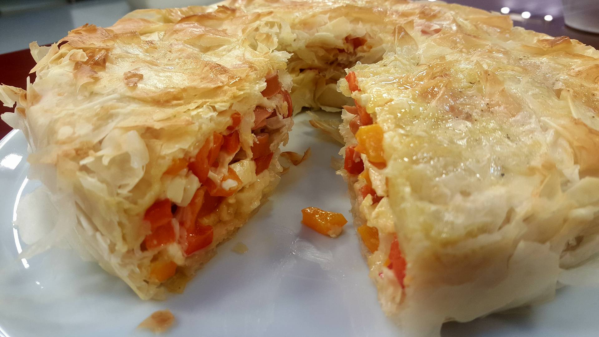 Përsëri mbulojmë mbushjen e dytë me petë të rrudhur, 1 ose 2 petë si të dëshironi. I spërkasim petët me yndyrë dhe vazhdojmë mbushjen e rradhës me spec dhe djathë dhie, përsëri vendosim 1-2 petë dhe mbushjen e fundit me kremviçe dhe djathë kaçkavall. Kthejmë në fund anët e petëve dhe do të formohet një byrek me pamjen e një keku. E vendosim byrekun në furrë në temperaturën 200 gradë Celsius për 30-35 minuta. E lemë pak të ftohet dhe më pas e presim në feta dhe pamja e tij kur të pritet do të jetë shumë dekorative dhe me një shije shumë të mirë.