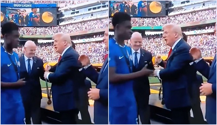 Pas sfidës, nuk munguan momentet e veçanta. Siç shihet në video, lojtari i Chelseat, Tyrick George hezitoi t’i japë dorën presidentit të SHBA, Trump, gjatë kohës kur po shpërndaheshin medaljet.