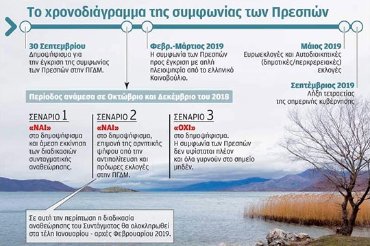 Tre skenarë të mundshëm janë paraparë për periudhën midis tetorit dhe dhjetorit të vitit 2018, varësisht nga rezultati i referendumit në përputhje me periudhën kohore të paraparë në Marrëveshjen e Prespës, njofton gazeta greke “Kathimerini”.