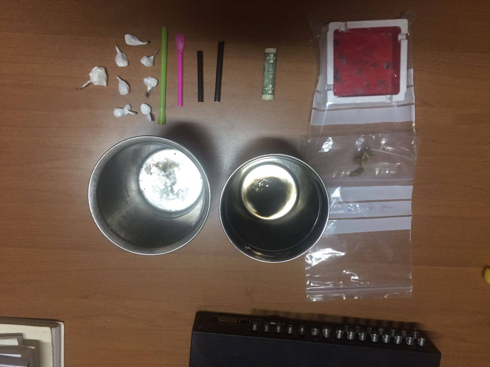 – 2 kanaçe inoksi (për ngrohjen e lëndës narkotike, me mbetje lëndë të dyshuar narkotike)