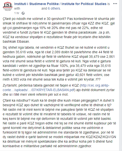 Instituti i Studimeve Politike ka publikuar disa të dhëna për votimet e 30 qershorit. Sipas ISP për Elbasanin dalin rreth 3 mijë vota më shumë se fletë votimi për kryetar bashkie, referuar po vetë të dhënave të publikuara nga KQZ dhe po e njëjta gjë ndodh edhe votat për Këshillin Bashkiak.