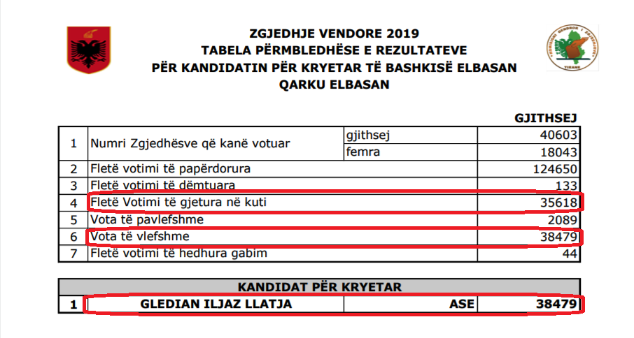 Siç shihet nga tabela, në vendimin e KQZ thuhet se në kutinë e votimit u gjenden 35,618 vota, nga të cilat 2,089 dolën të pavlefshme dhe 44 fletë të hedhura gabim, ndërkohë që fletë të vlefshme KQZ shpall 38,479 ose 2,861 vota më shumë sesa fletët e votimit të gjetura në kuti. Nga votat e gjetura kandidati i vetëm në zgjedhje ka fituar 100%, pra 38,479 vota nga 35,618 fletë-votimi të gjendura në kuti. Nga ana tjetër po KQZ ka deklaruar se në kutinë e votimit për këshillin bashkiak janë gjetur 40,601 fletë votimi, ose rreth 4,983 vota më shumë sesa tek kutia e votimit për kryetar..!??