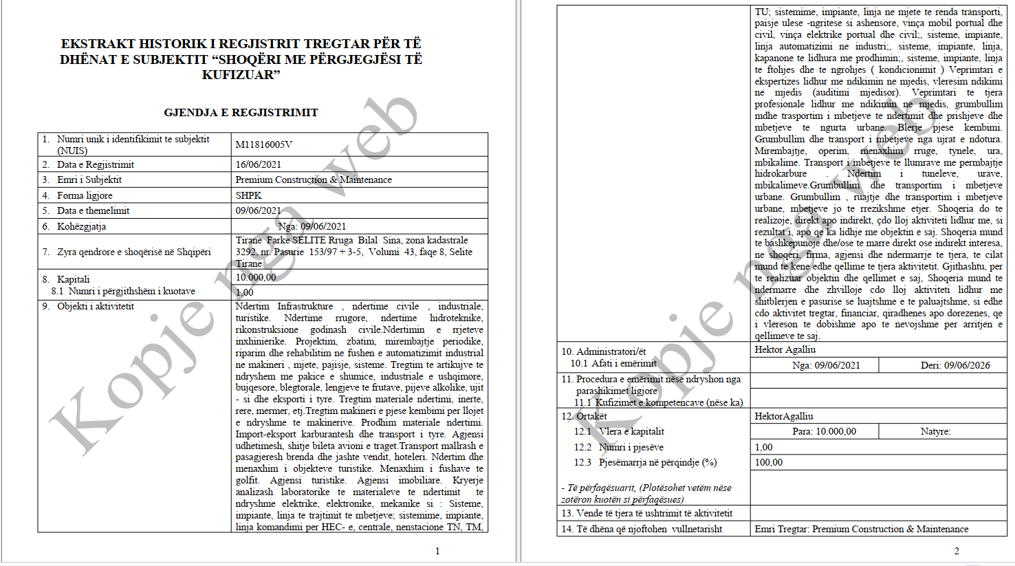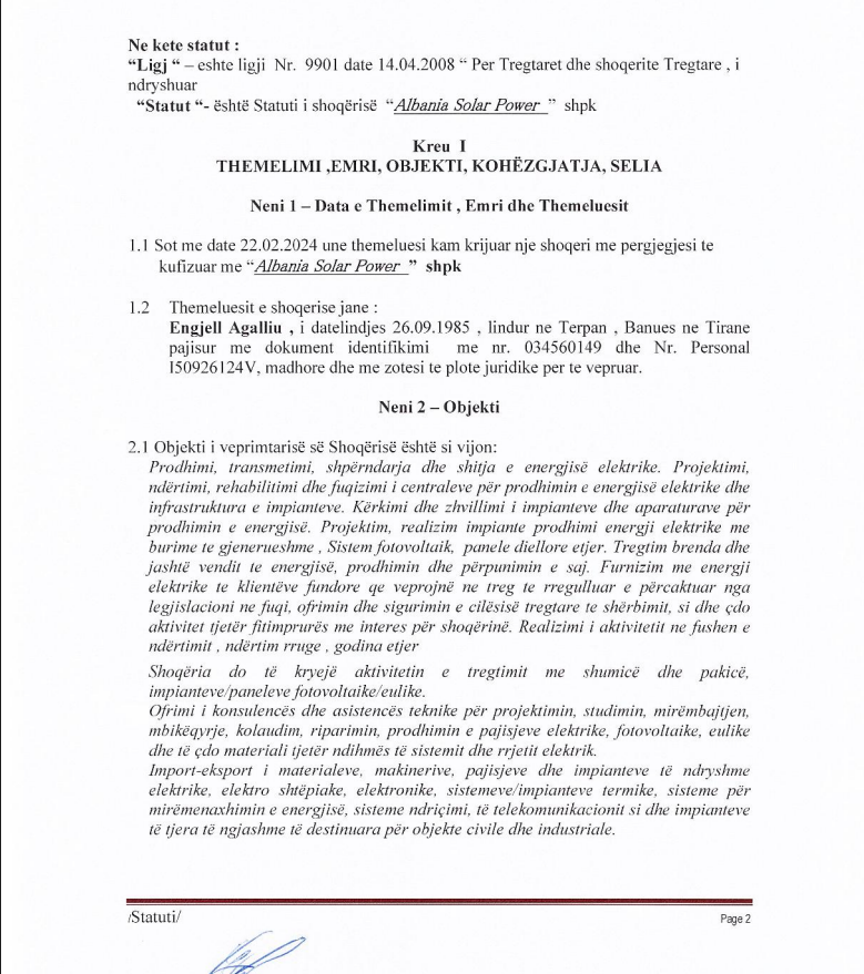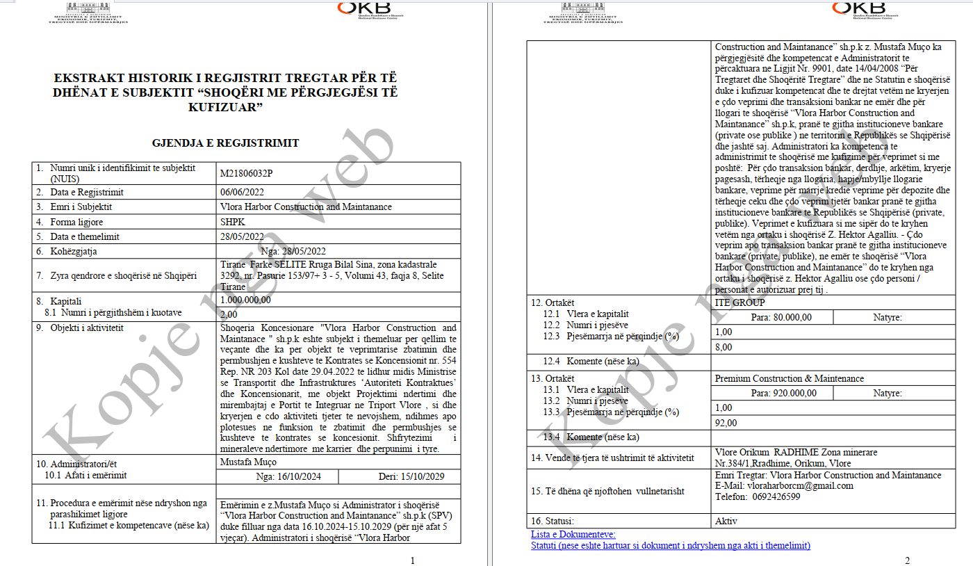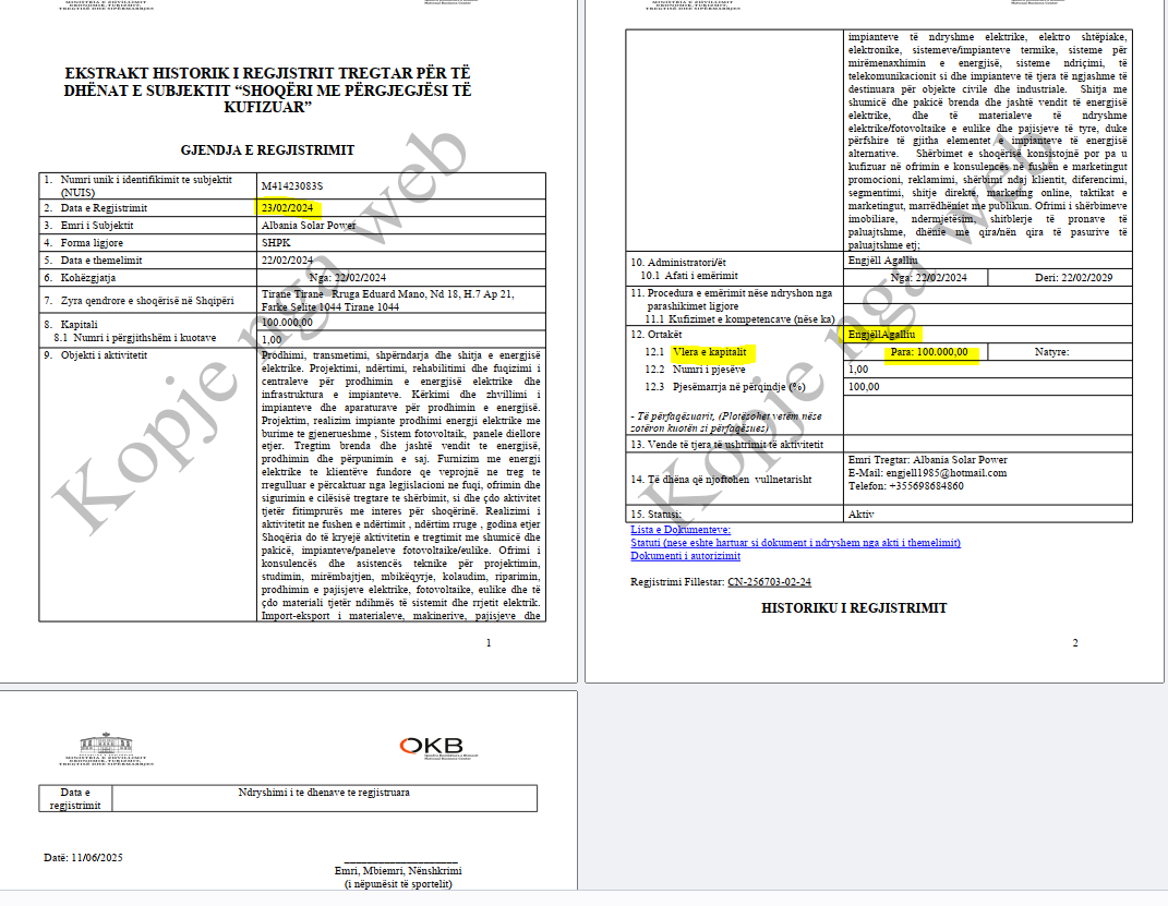 Ndërkohë ky subjekt është regjistruar vetëm 16 muaj më parë, me një kapital 100.000 lekë, ka administrator dhe pronar Engjëll Agalliu dhe asnjë bilanc të publikuar në QKB.