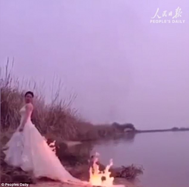 Nusja shihet duke pozuar pranë liqenit Fuzhou dhe një asistent i vë zjarrin fustanit. Në këto momentet fotografi Zheng, bën shkrepjet e kërkuara. Zjarri vazhdon që të djegë fustanin dhe flakët arrijnë deri tek shpina e nuses. Këtë ide nusja e kishte parë në internet dhe i kishte pëlqyer shumë.