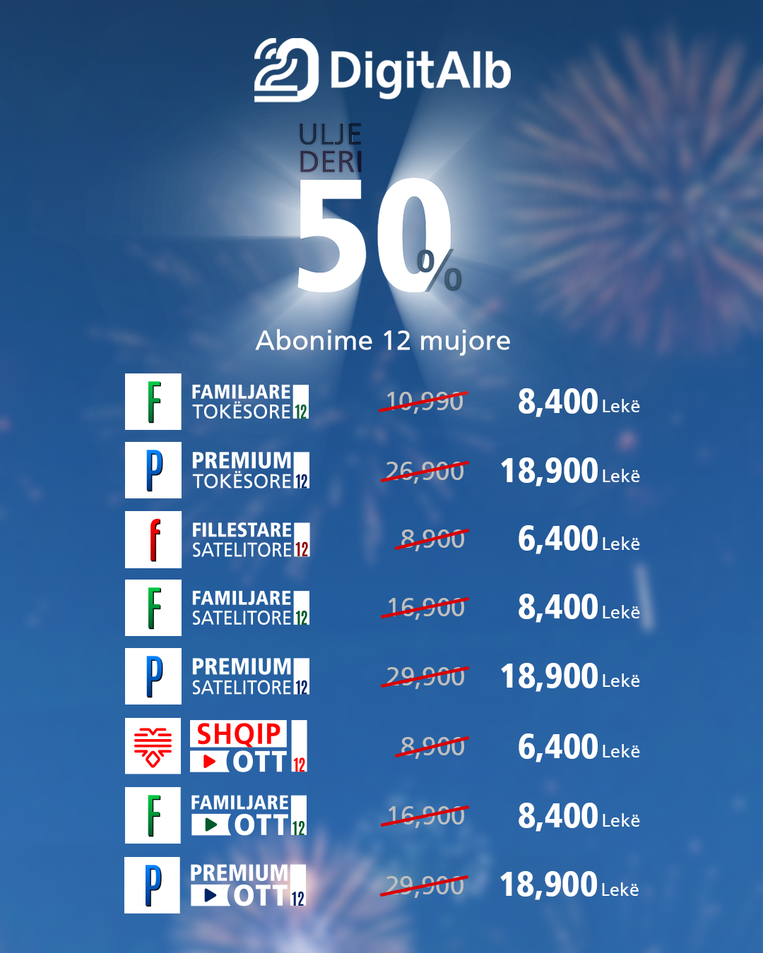 E sot ky 20 Vjetor e gjen platformën më të dashur të shqiptarëve, më të rritur, më të fortë e të shtrirë në mbarë botën. Krahas platformave tokësore e satelitore, DigitAlb prej pak vitesh tashmë, transmeton edhe përmes platformës OTT, risia teknologjike e transmetimit për të shikuar gjithçka që dëshiron, kur ti dëshiron dhe për më tepër në çdo vend të botës përmes internetit, sepse DigitAlb është platforma televizive e të gjithë shqiptarëve. Për të festuar me të gjithë ju, DigitAlb vjen me një ofertë speciale me ulje çmimesh deri në 50%, si asnjëherë më parë. 20 Vjet DigitAlb dhe ky është vetëm fillimi….