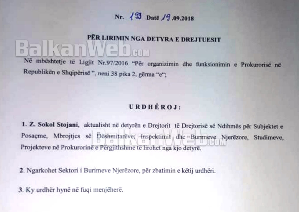 Marku ka urdhëruar lirimin nga detyra të Stojanit i cili mbante postin e Drejtorit të Drejtorisë së Ndihmës për Subjektet e Posaçme, Mbrojtjes së Dëshmitarëve, Inspektimit dhe Burimeve Njerëzore, Studimeve, Projekteve në Prokurorinë e Përgjithshme. Urdhri i kryeprokurores mban datën 19 shtator, pra dy ditë më parë.