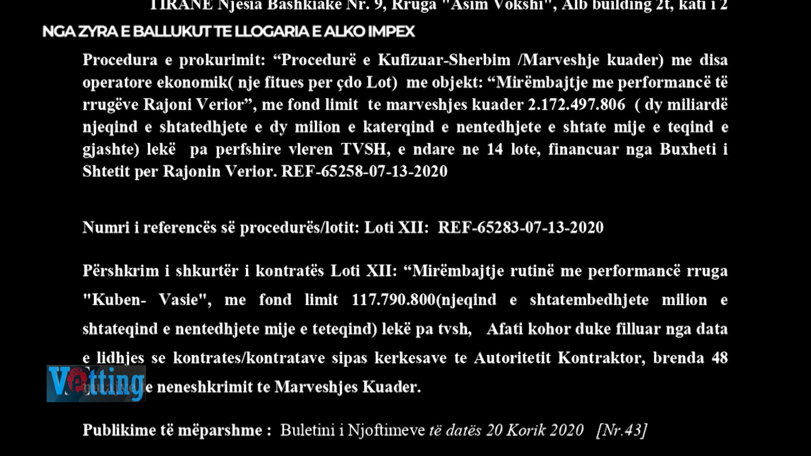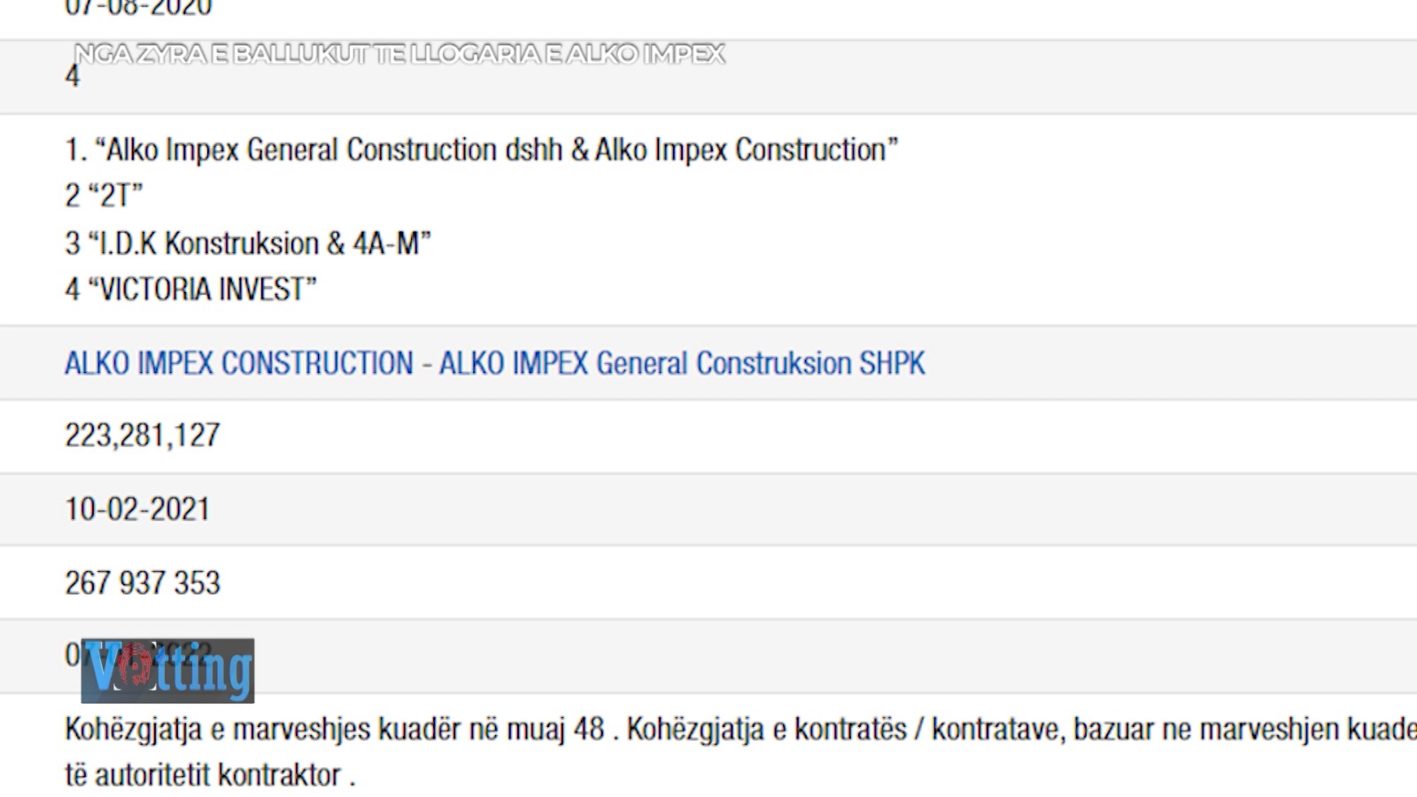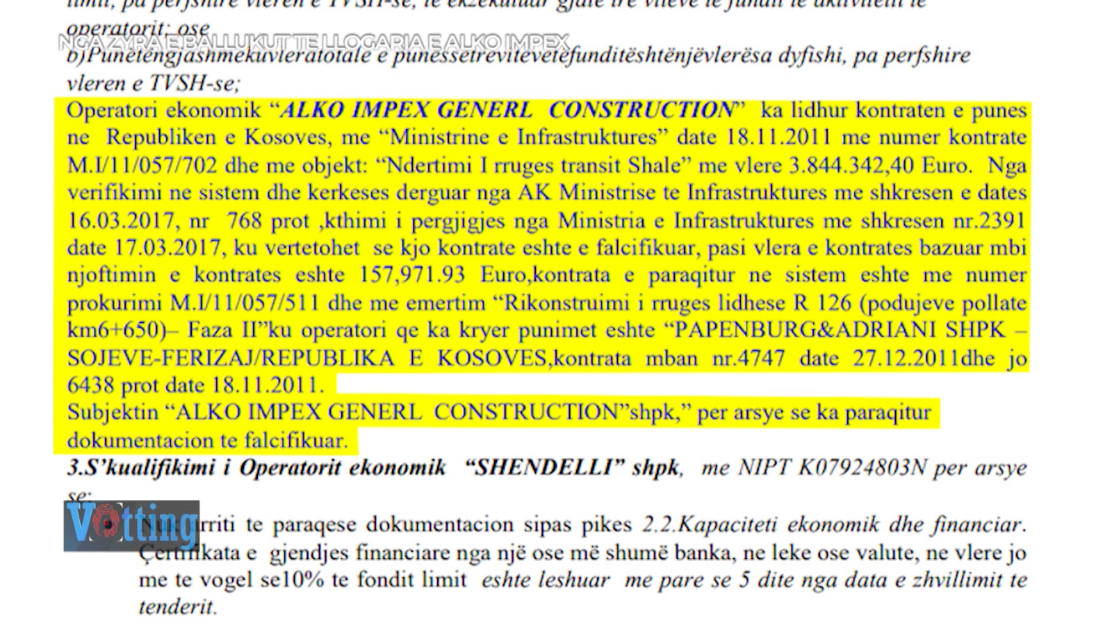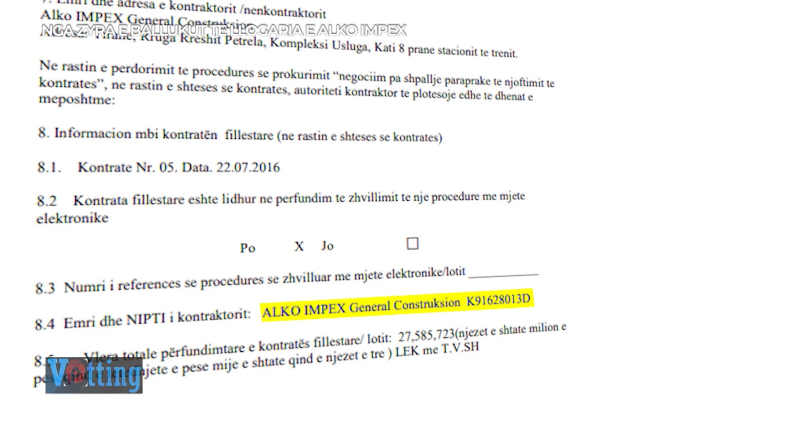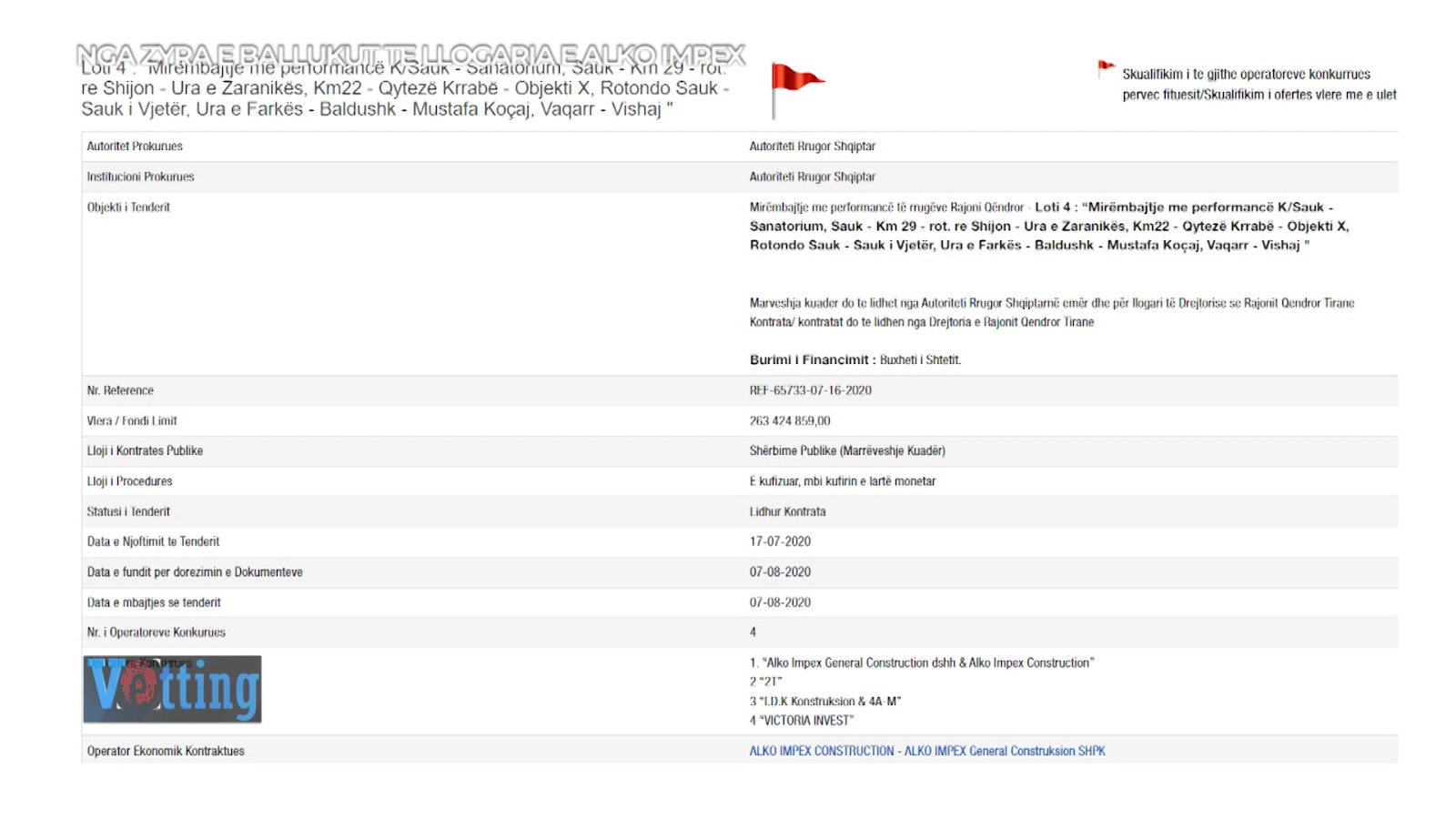 Gara u shënua me flamur të kuq sepse dy kompanitë e tjera, që kishin bërë ofertë më të ulët u skualifikuan nga institucioni, duke shfaqur indicie për favorizim fituesi. Dy muaj më pas në buletinin zyrtar, kompania që kishte lidhur kontratën do të shfaqej përsëri “ALKO IMPEX” shpk, me numrin e niptit të “ALKO IMPEX CONSTRUCTION”.