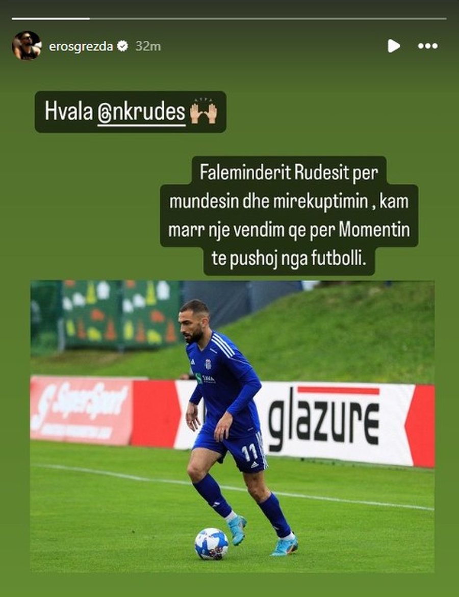 Eros Grezda ka ndarë rrugët me klubin e Rudes në Kroaci. Lojtari, i cili më parë ka luajtur për kombëtaren, nëpërmjet një postimi në rrjetet sociale ka njoftuar se për momentin do të pushojë nga futbolli.