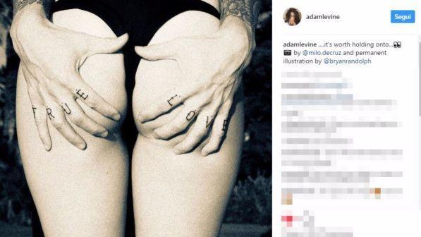 Një foto artistike për Adam Levine që pasi ka bërë një tatuazh të ri me shkrimin ‘True Love’ e ka treguar duke i mbështetur duart në të pasmet e bashkëshortes Behati Prinsloo.
