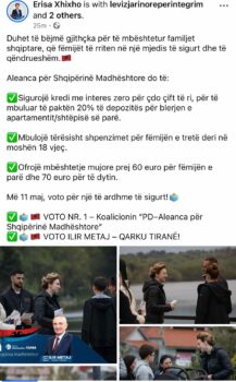 Në një postim në rrjetin social Facebook, zv Presidentja e Partisë së Lirisë Erisa Xhixho ka bërë thirrje qytetarëve që të votojnë koalicionin “PD- Aleanca për Shqipërinë Madhështore dhe ish-presidentin Meta për një të ardhme të sigurt në zgjedhjet e 11 majit.