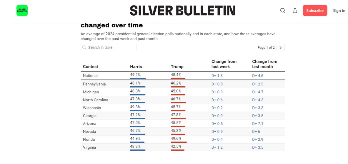 Aktualisht Nate Silver publikon një buletin ditor (i quajtur Silver Bulletin), ku bën përmbledhjen statistikore të të gjitha sondazheve që zhvillohen në 50 shtetet e SHBA-së në lidhje me garën presidenciale. Në buletinin më të fundit, ai ka llogaritur mesataren e ponderuar statistikisht të të gjitha sondazheve aktuale, duke e krahasuar atë me një javë dhe një muaj më parë.