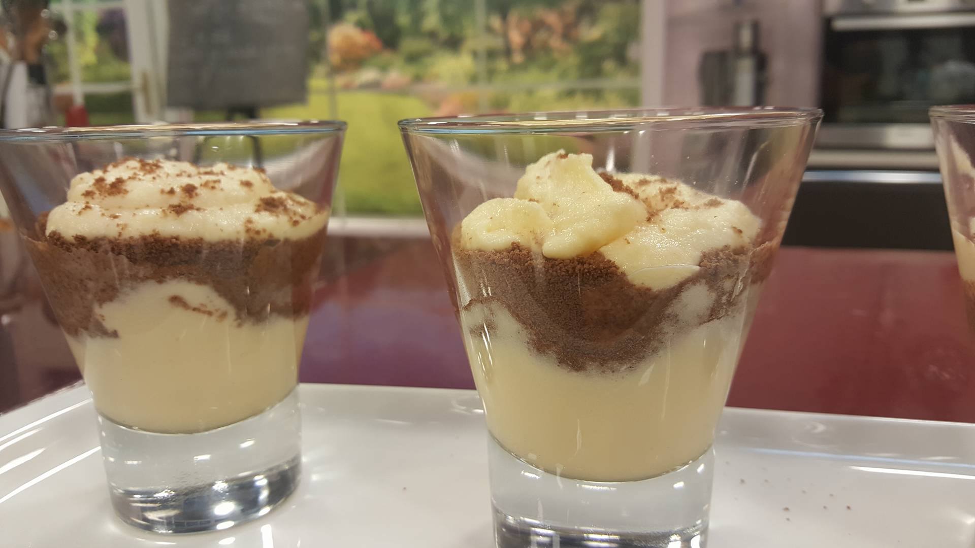 Grijmë biskotat duke i kthyer ato në grimca të vogla. Ndajmë vezët, të verdhat në një tas dhe të bardhat në një tas tjetër. Fillimisht rrahim të verdhat me 2 lugë sheqer derisa sheqeri të shkrijë plotësisht dhe vezët të fillojnë të zbardhen, shtojmë lugë-lugë maskarponen derisa kremi me vezë të lidhet mirë. Në një tas tjetër rrahim të bardhat e vezëve derisa ato të behen marengë e fortë. Më pas lugë-lugë shtojmë marengën tek tasi me të verdhat e vezëve. Vendosim ne çdo gotë pak krem, shtojme një shtresë me biskota të grira, të cilat mund ti spërkasim me pak qumësht ose kafe. I mbushim përsëri gotat me krem duke shtuar shtresa me biskota sa të dëshironi 1,2 ose 3. Në fund e mbyllim ëmbëlsirën në gotë me krem dhe thërrime biskotash ose me pak çokollatë të grirë.