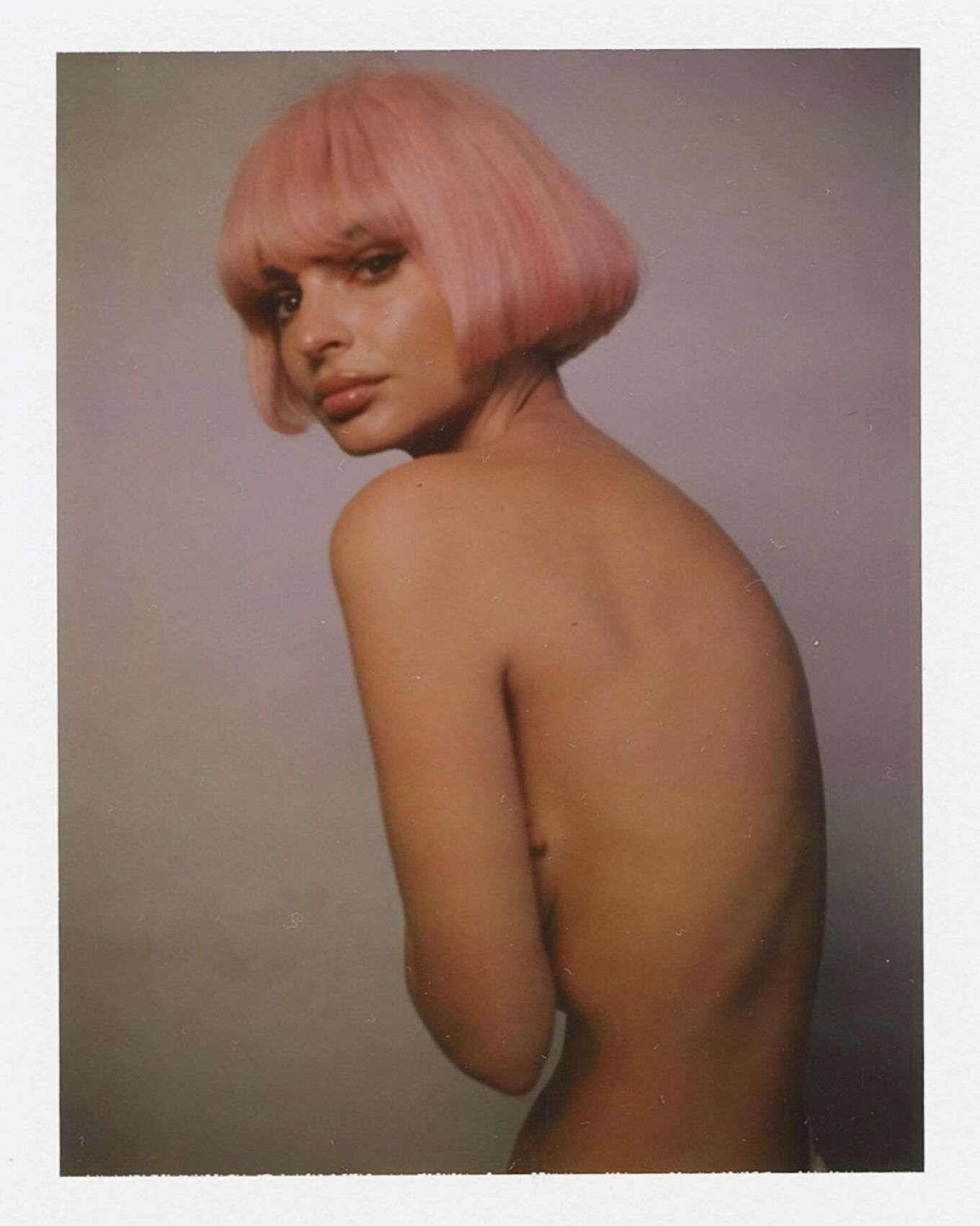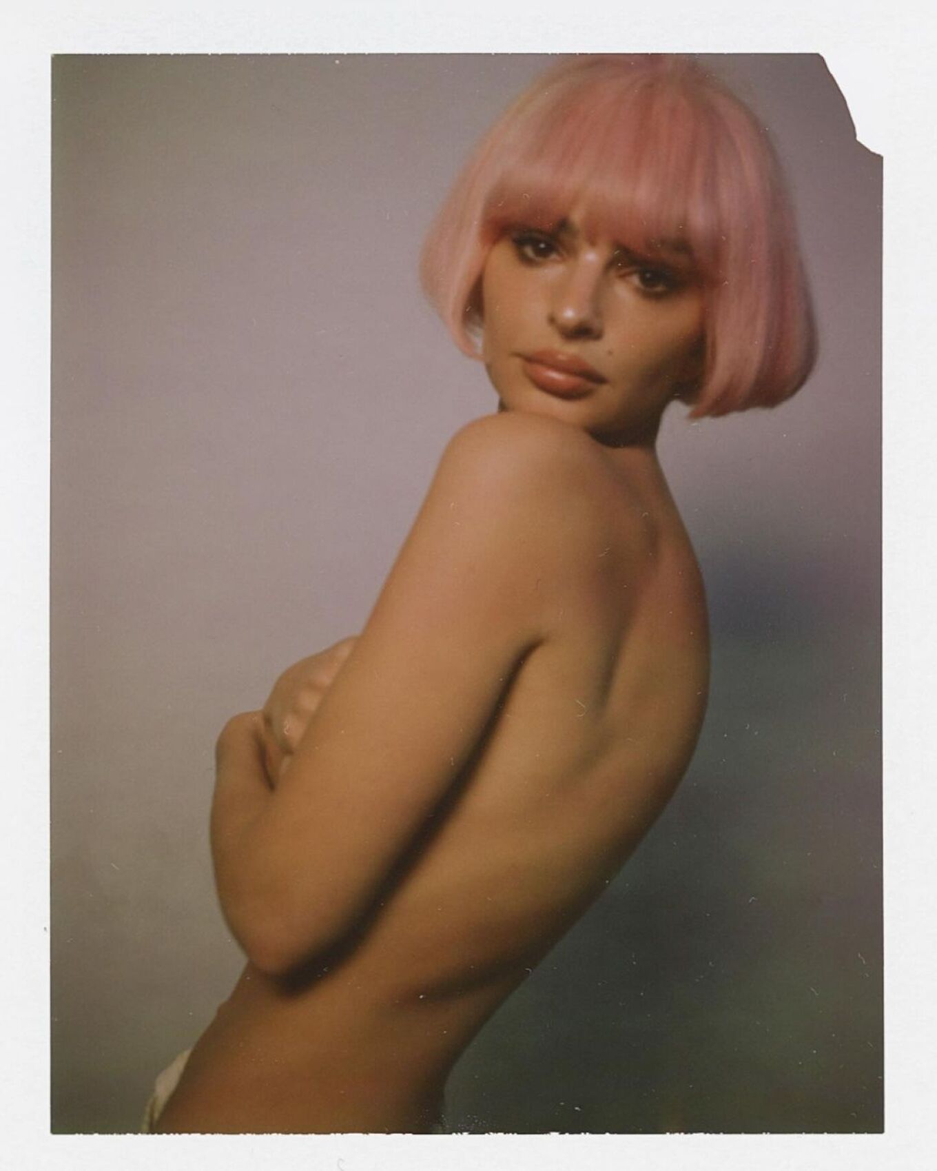 Në disa nga fotot, Emily Ratajkowski shfaqet e zhveshur, e veshur me një parukë bjonde dhe duke mbuluar me dorë dhe flokë gjoksin. Në të tjerat, ajo mban një parukë të shkurtër rozë.