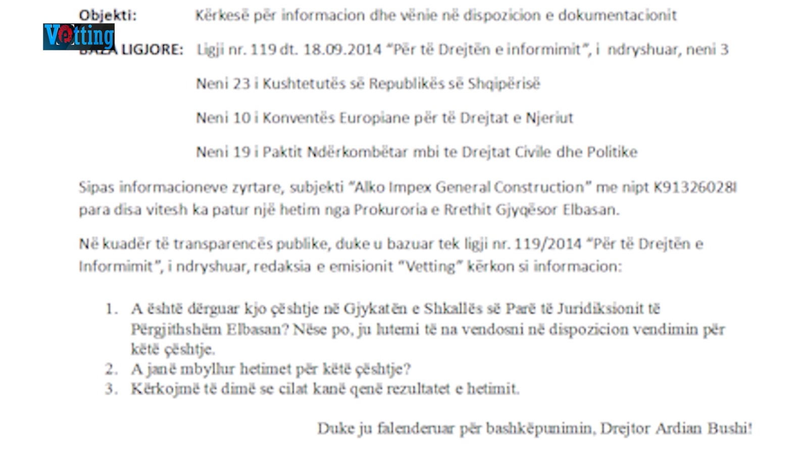 Sipas informacioneve publike, Prokuroria e Elbasanit do të niste një hetim për rastin e Alko-Impex General Construction. “Vetting” kontaktoi Prokurorinë e Elbasanit për hetimet e këtij rasti, por deri në publikimin e këtij materiali nuk pati asnjë koment nga Prokuroria.