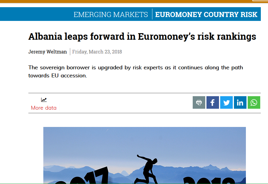 Shqipëria, sipas ekspertëve të vlerësimit të Euromoney ka marrë 38 pikë, nga 100 që është maksimumi, dhe ende konsiderohet një huamarrës me rrezik të lartë në katër nga pesë kategoritë e rrezikut të Euromoney. Megjithatë, pikët dhe renditja janë përmirësuar, duke bërë që Shqipëria të ngjitet në vendin e 89, nga 186 vende në renditje, duke ia kaluar Maqedonisë –që tashmë është dy vende më poshtë – dhe malit të zi (112), ndërsa Serbia është në vend të 75.