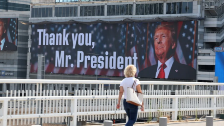 Një banderolë masive me imazhin e Presidentit të SHBA-së Donald Trump dhe mesazhin “Faleminderit, Z. President” u shfaq në një autostradë qendrore në Tel Aviv të dielën, menjëherë pasi sulmet ajrore amerikane goditën tre lokacione kryesore bërthamore në Iran.