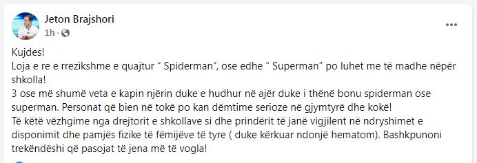“Kujdes! Loja e re e rrezikshme e quajtur ‘Spiderman’, ose edhe ‘Superman’ po luhet me të madhe nëpër shkolla! 3 ose më shumë veta e kapin njërin duke e hedhur në ajër duke i thënë bëhu spiderman ose superman. Personat që bien në tokë pësojnë dëmtime serioze në gjymtyrë dhe kokë”, ka shkruar Brajshori.
