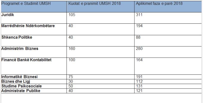 Sipas të dhënave zyrtare për UMSH,pas shpalljes së fituesve nga Ministria e Arsimit dhe e Sporteve në Juridik, për 105 kuota, aplikojnë 311 kandidatë. Në Marrëdhënie Ndërkombëtare për 40 kuota kanë aplikuar 194 kandidatë. Në Shkenca Politike për 40 kuota aplikojnë 88 kandidatë. Në Administrim Biznes për 160 kuota aplikojnë 280 kandidatë. Në Financë Bankë kontabilitet për 100 vende kanë aplikuar 164 persona. Në informatikë biznesi për 75 vende aplikojnë 191 persona. Për Biznes dhe Ligj kërkesa është 3 herë më e lartë dhe për 30 vende aplikojnë 112 kandidatë. Për degën e Studimeve Psikosciale për 50 kuota aplikojnë 131 ndërsa për degën e Administratës Publike për 40 vende të lira ka 121 aplikime. Kandidatët duhet të bëjnë kujdes duke respektuar afatet e regjistrimit. Në rast se nuk regjistrohen në kohë, ata skulifikohen si fitues. Lista e fituesve të raundit të parë tashmë është afishuar në ambientet e UMSH si dhe gjendet online në web www.umsh.edu.al.