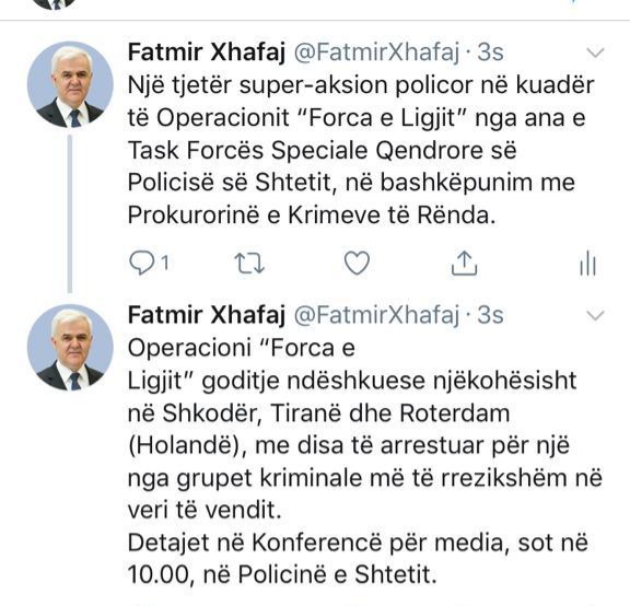 TIRANË- Operacioni “Forca e ligjit” godet sërish. Kështu bën të ditur Ministri i Brendshëm Fatmir Xhafaj në një postim në Twitter.