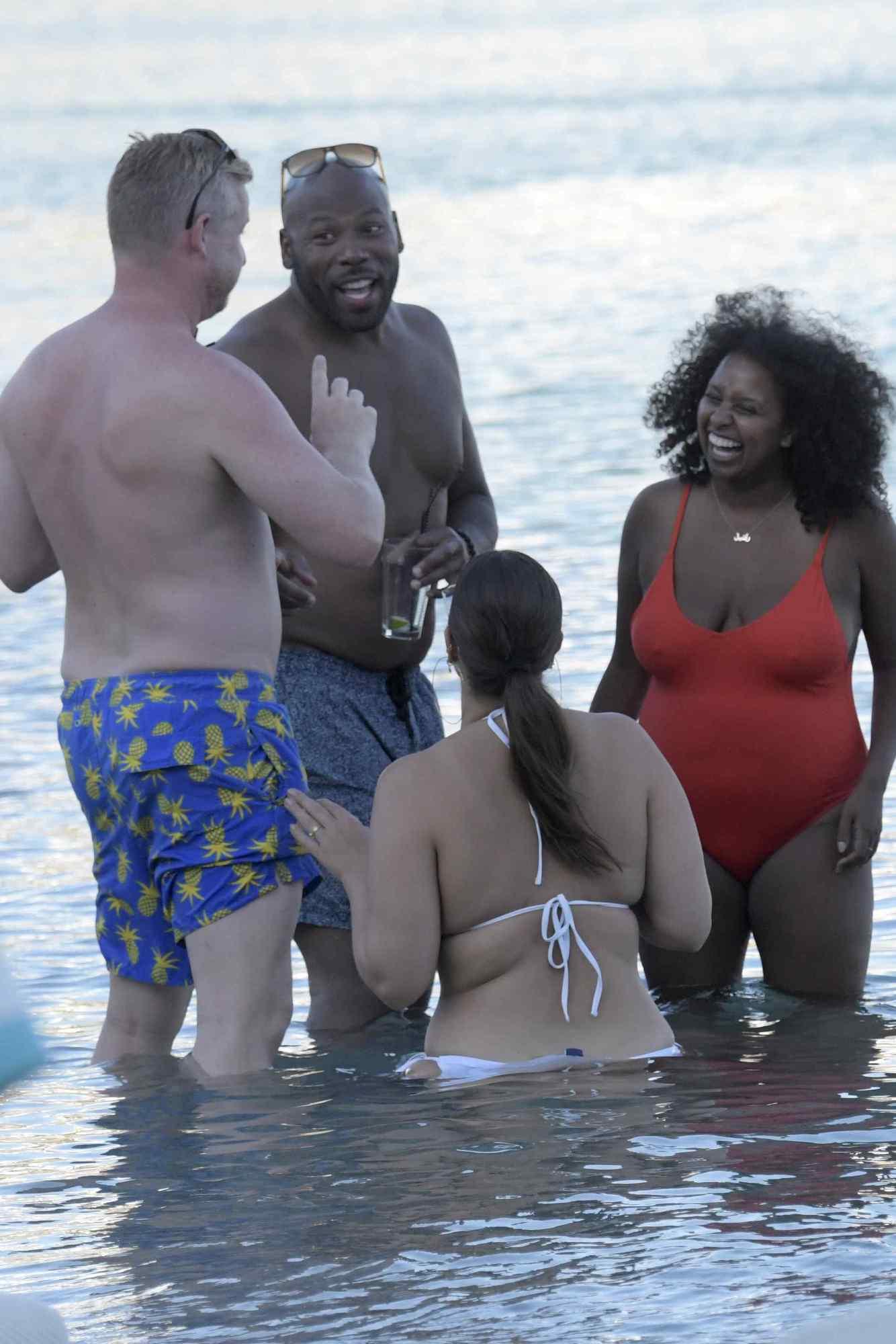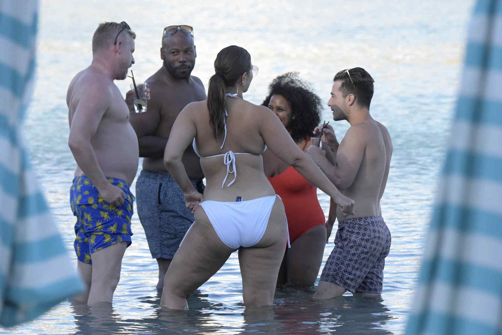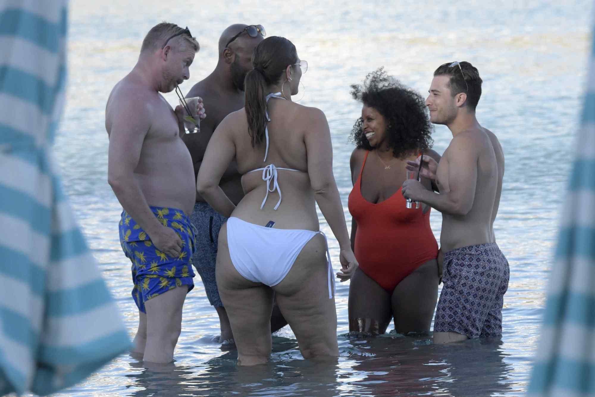 Me bikini të bardhë ajo zbavitet në shoqërinë e disa miqve duke kërcyer në ujë dhe duke shijuar diellin në Greqi.
