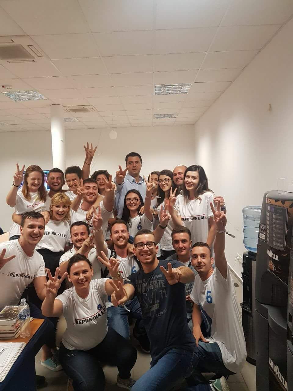 Takimi i kreut të PD, Lulzim Basha me presidentin e SHBA-së, Donald Trump me sa duket ka sjellë një atmosferë tejet pozitive në selinë blu. Në PD atmosfera optimiste po vazhdon akoma dhe këtë e tregon qartazi edhe kjo foto e kryetarit, Basha me të rinjtë e forumit rinor. Në foto të rinjtë me bulza te veshura me “Republikën e re “ pozojnë sëbashku me Bashën me dy gishtat lart, simbol i kahershëm i partisë demokratike por sot si për ironi të fatit “dy gishtat” po përdoren simbolikisht në fushatë edhe kundërshtari i tij, Edi Rama, për faktin se PS renditet e dyta në fletën e votimit.