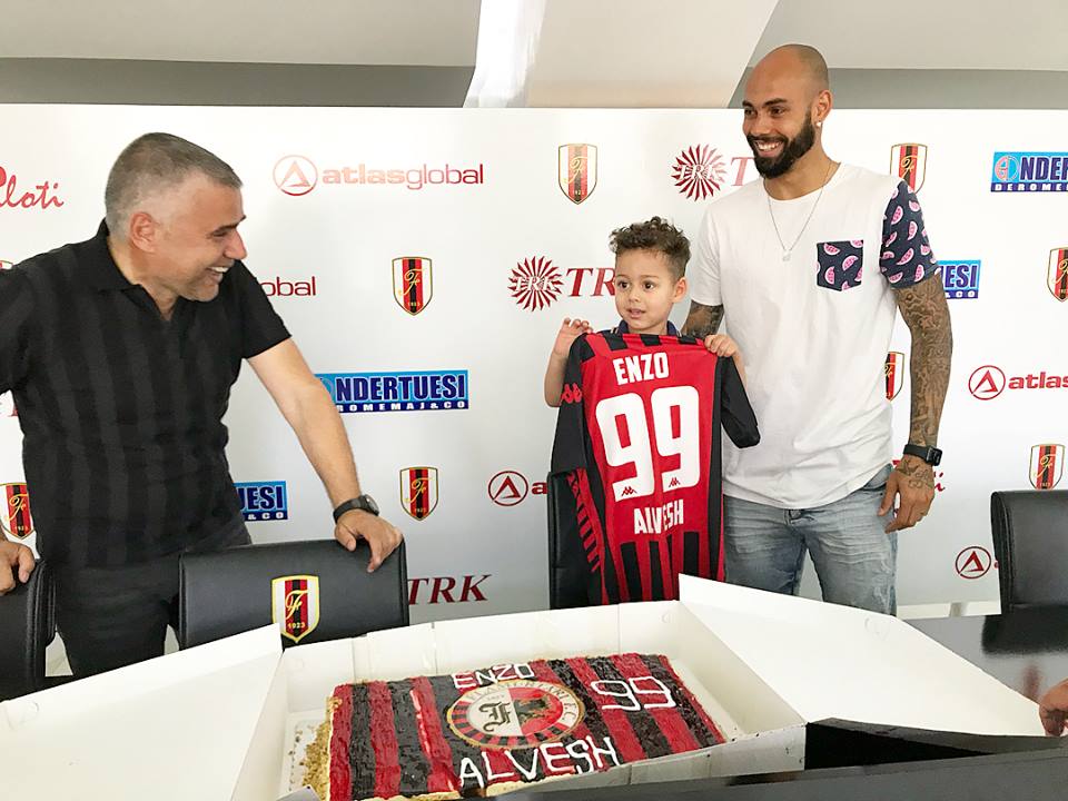 Alves ka postuar disa foto teksa shihet bashkë me djalin e tij, Enzo-n, me presidentin Sinan Idrizi, me familjarë dhe staf të kuqezinjve, duke pasur përpara një tortë me ngjyrat dhe stemën e Flamurtarit, si dhe numrin e tij të fanellës.