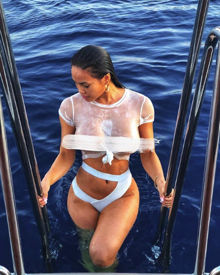 Artistja 31 vjecare po kalon disa ditë pushime në ishujt grek dhe në disa foto shfaqet seksi dhe provokuese mbi një motor uji, e lagur plotësisht, duket treguar të gjithë gjoksin.
